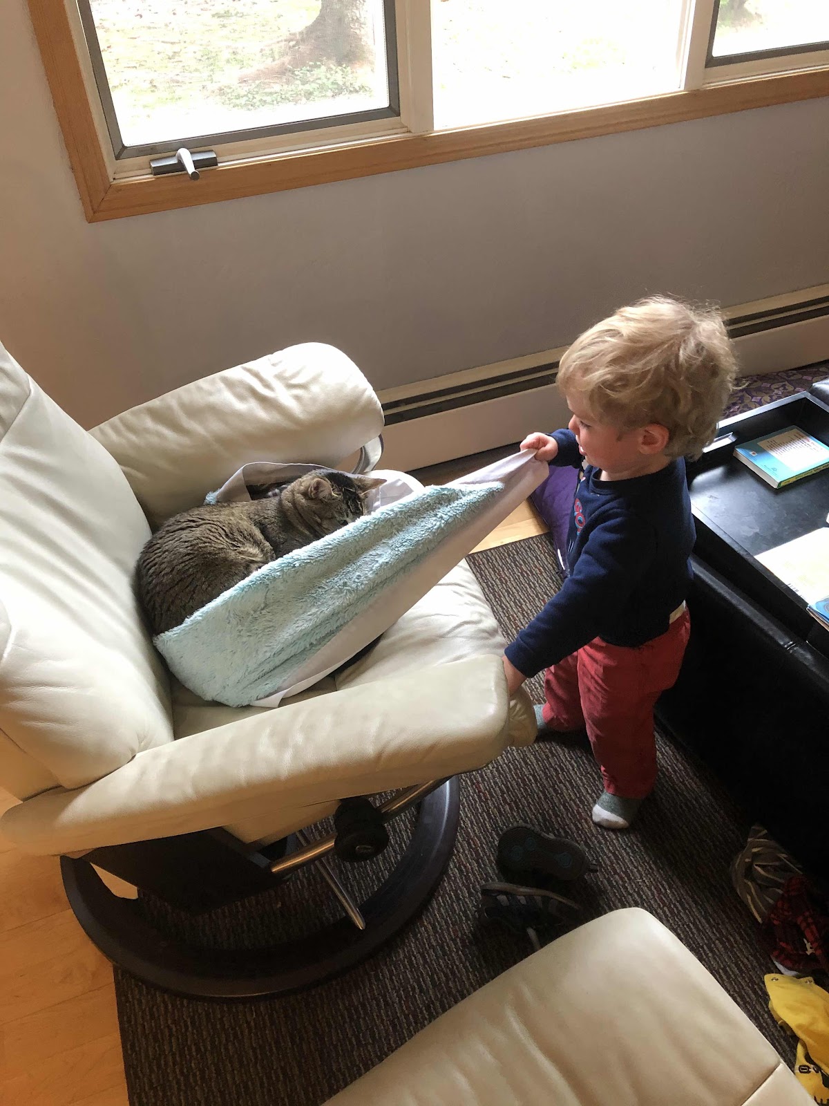 Lucy decided to take a nap on Josy’s blanket. He was not amused. In fact, he was very frustrated that he wasn’t strong enough to pull it out from under her.