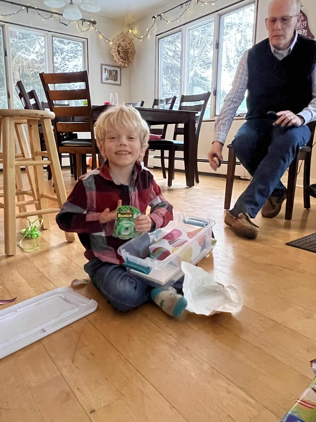 Gabe is super into crafts right now. He’s been asking for tape for his birthday for months. So we got him a whole bunch of craft supplies. I kindof laughed that we literally got him school supplies for his birthday and he loved it.